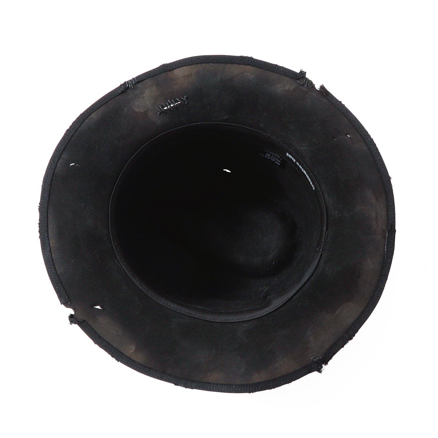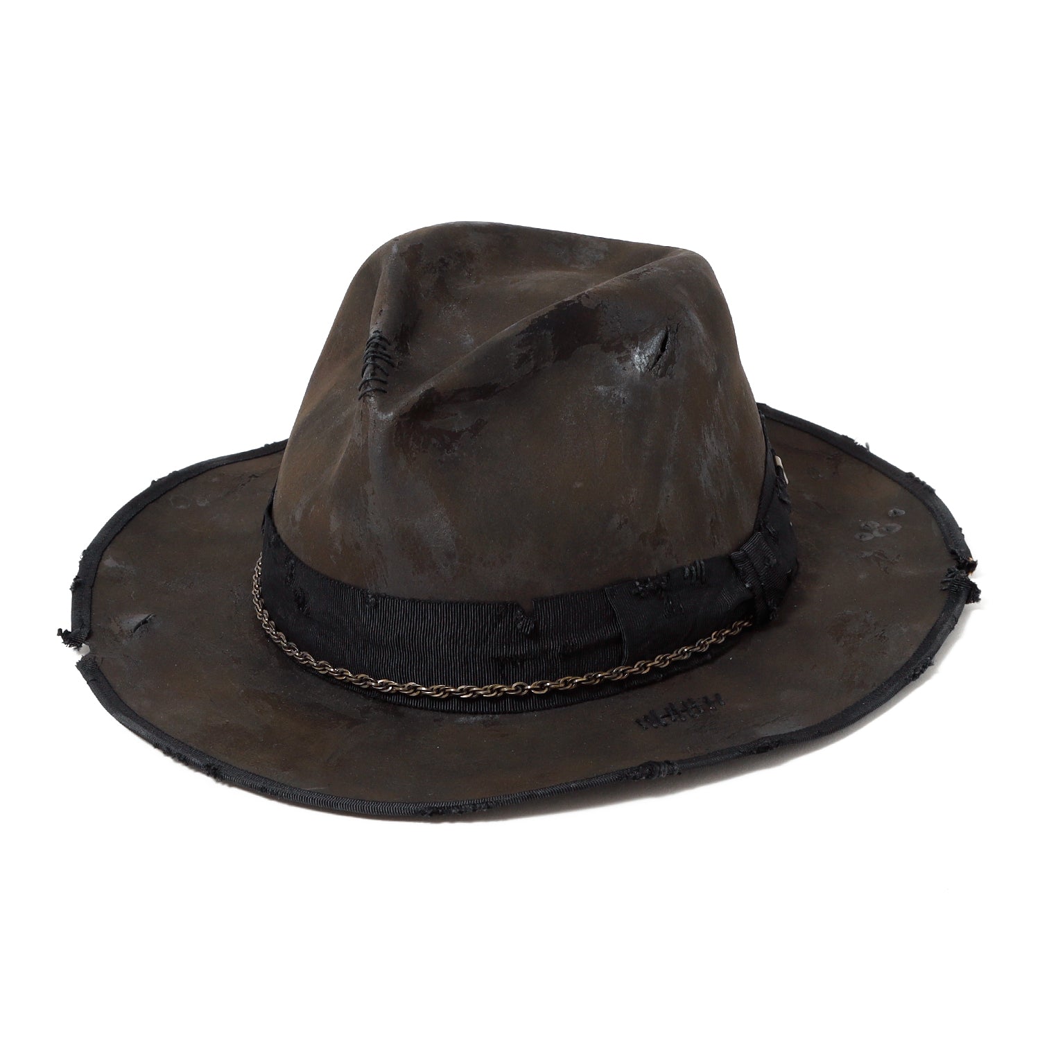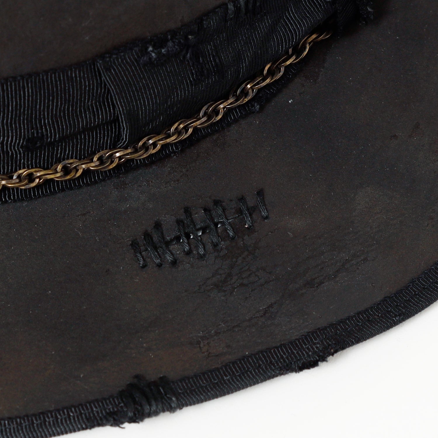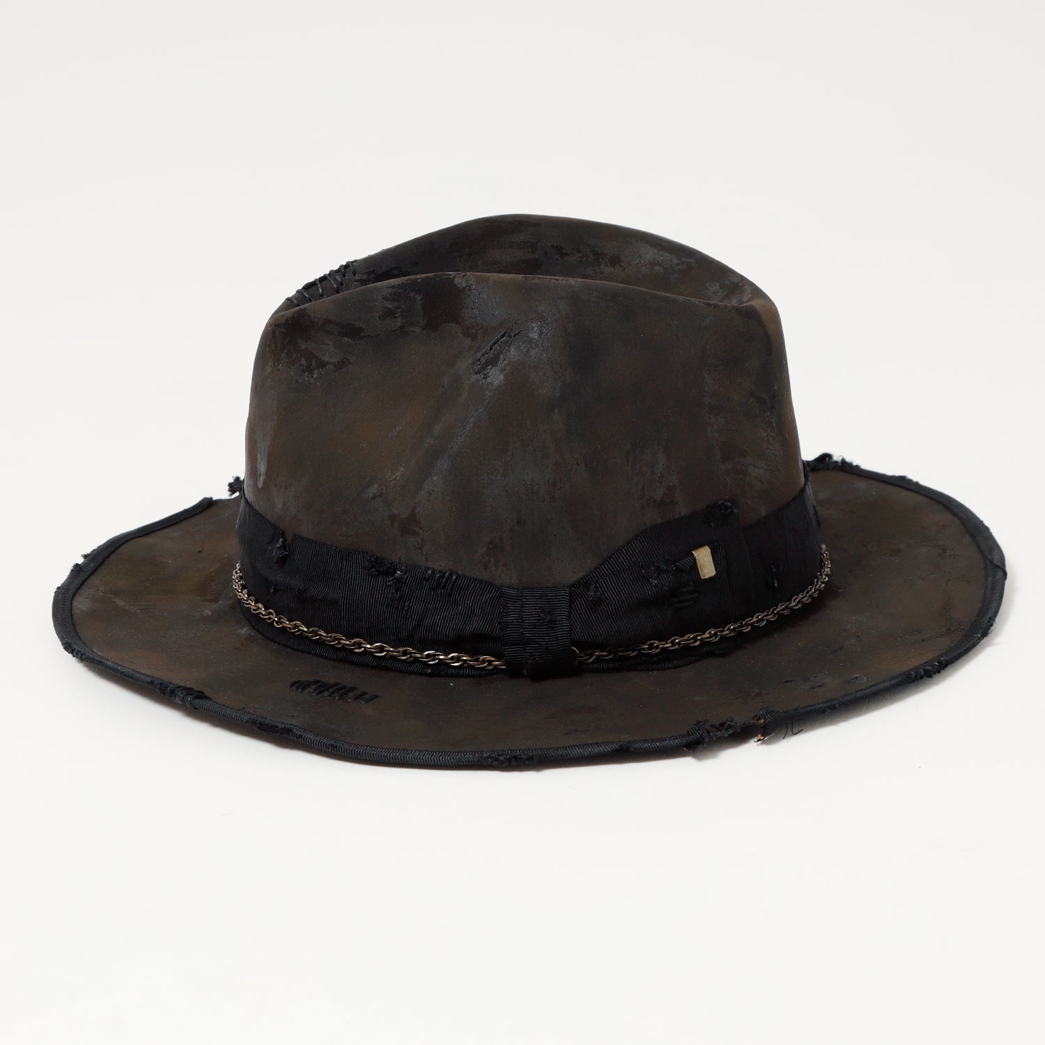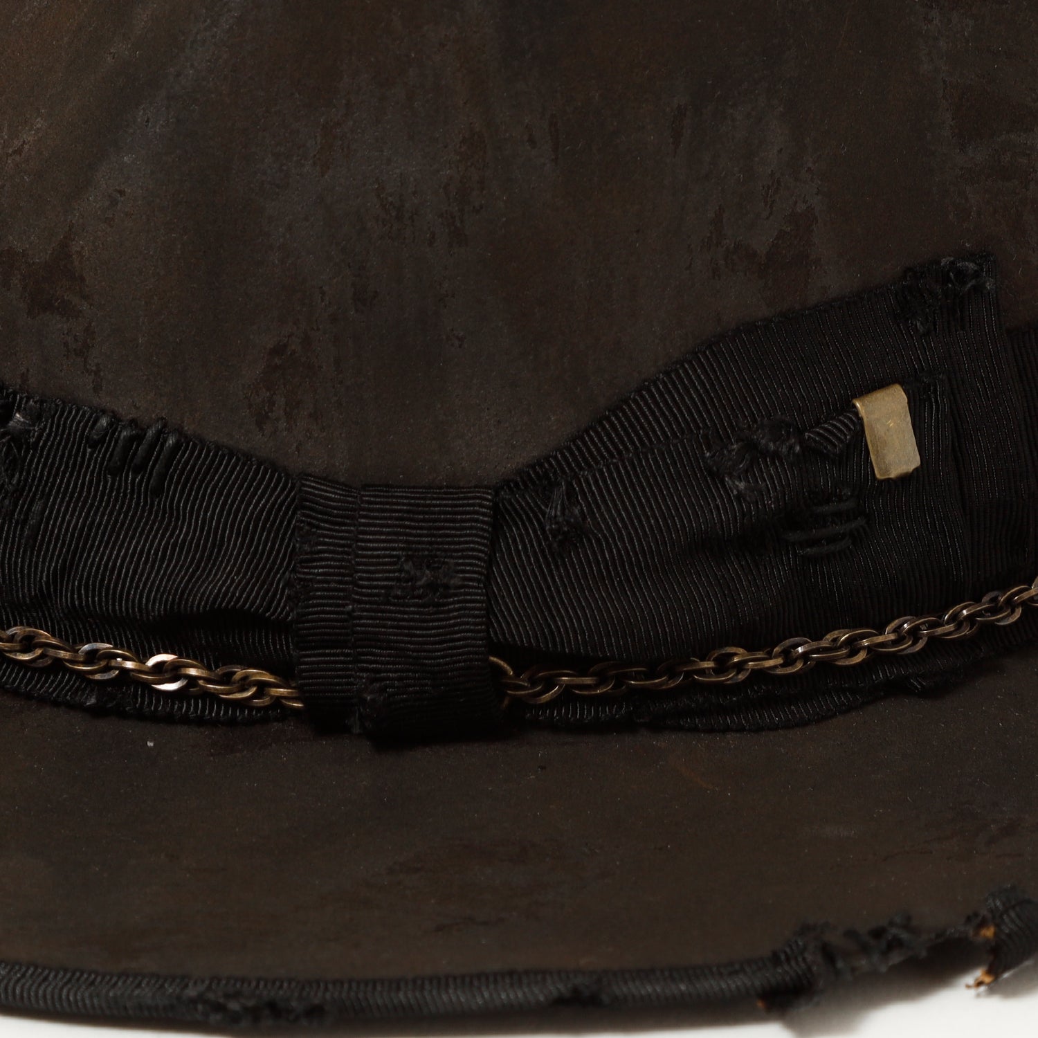 ■MATERIAL本体:ビーバー飾り:グログランリボンチェーン、金具■SIZE57.5cm~59cm(サイズ調節すべり付き)長さ/クラウンのフロント10.5cm、ブリム6.5cmビーバー帽体を、炭のような雰囲気になるまでバーン加工した「charcoal」シリーズの中折れハット。特殊な保護剤を付けて、加工をとれにくくしています。飾りには、ダメージ加工したグログランリボン、アンティークゴールドのチェーン、金具を使用しています。ブリムはパイピング仕上げです。※水や湿気に大変弱く、濡れると型崩れや色落ちをする可能性があります。雨などは避けてご使用ください。※手作業の製作してるため商品によって個体差がございます。