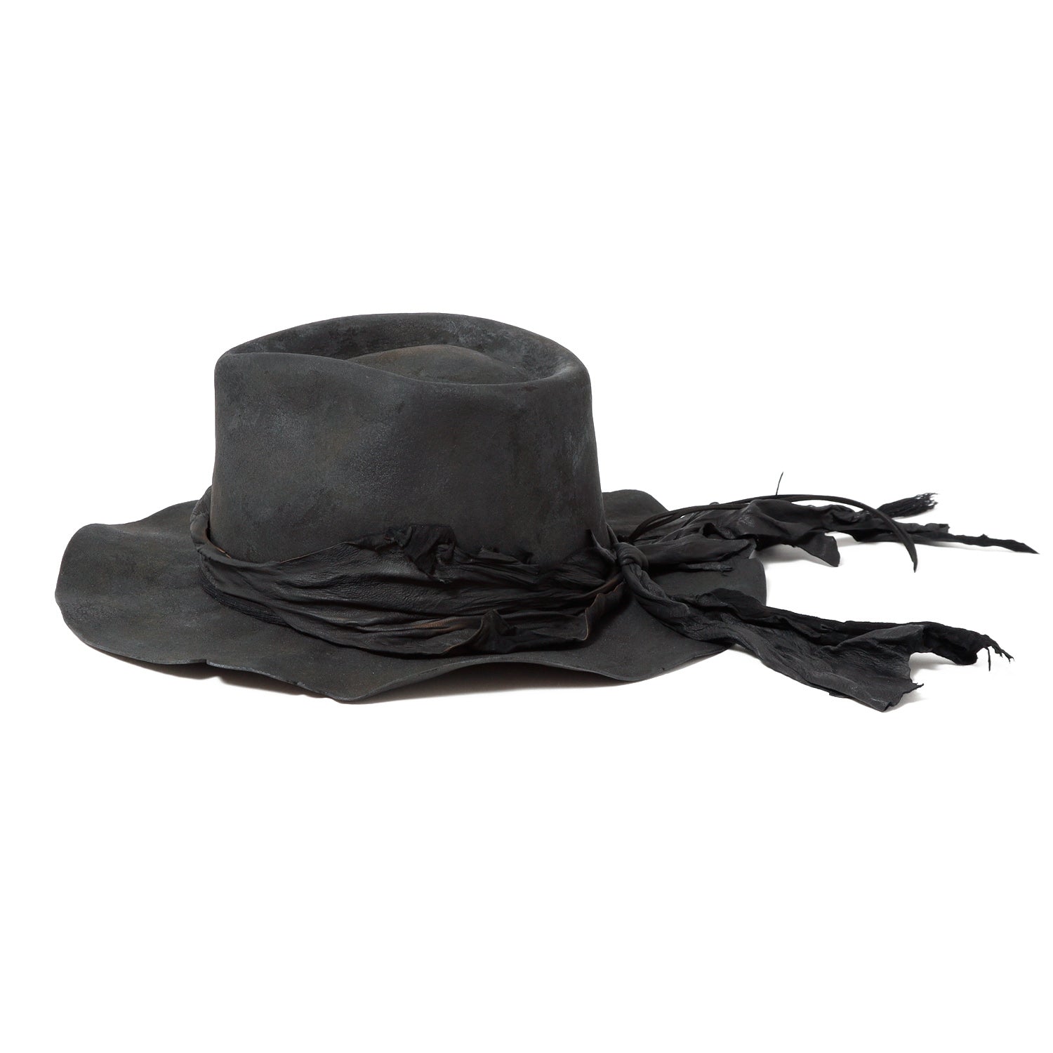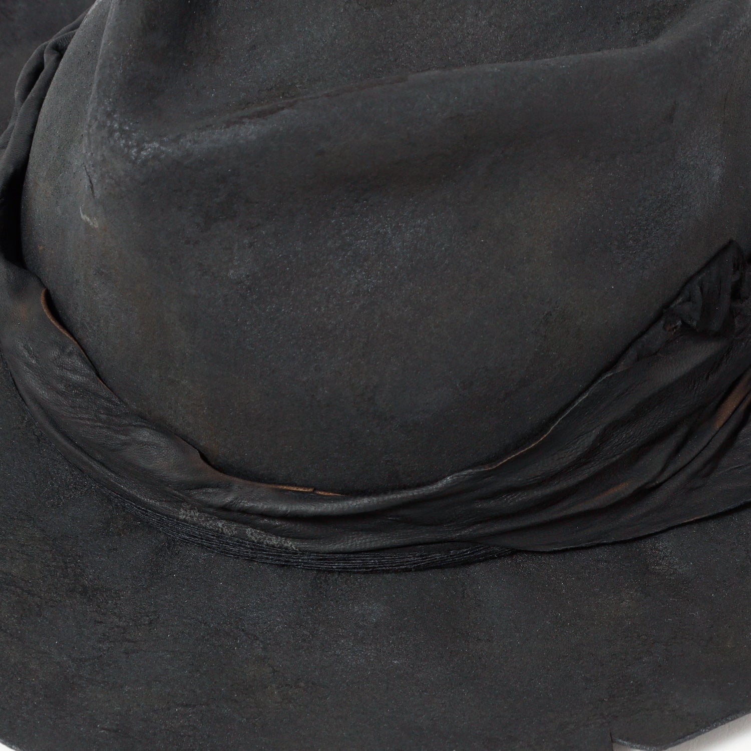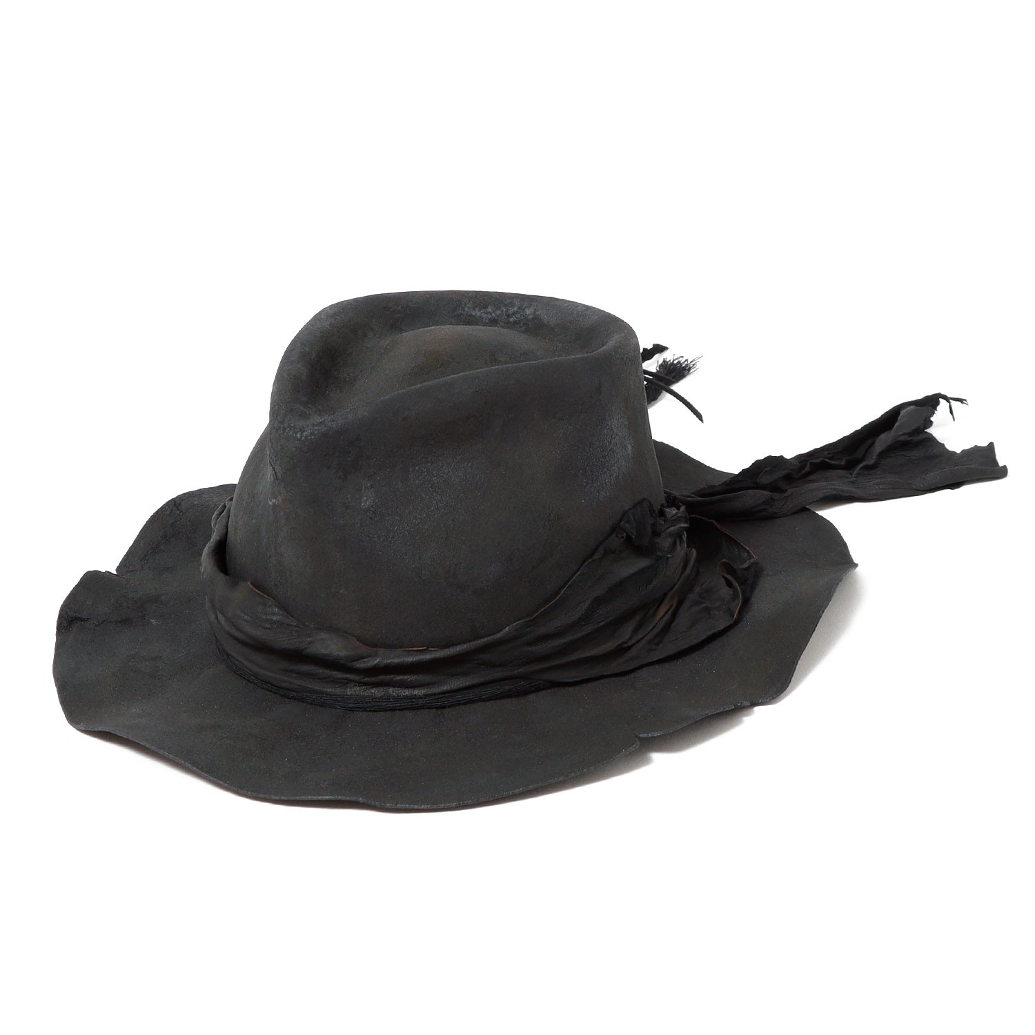 ラビット帽体を、炭のような雰囲気になるまでバーン加工した「charcoal」シリーズの中折れハット。