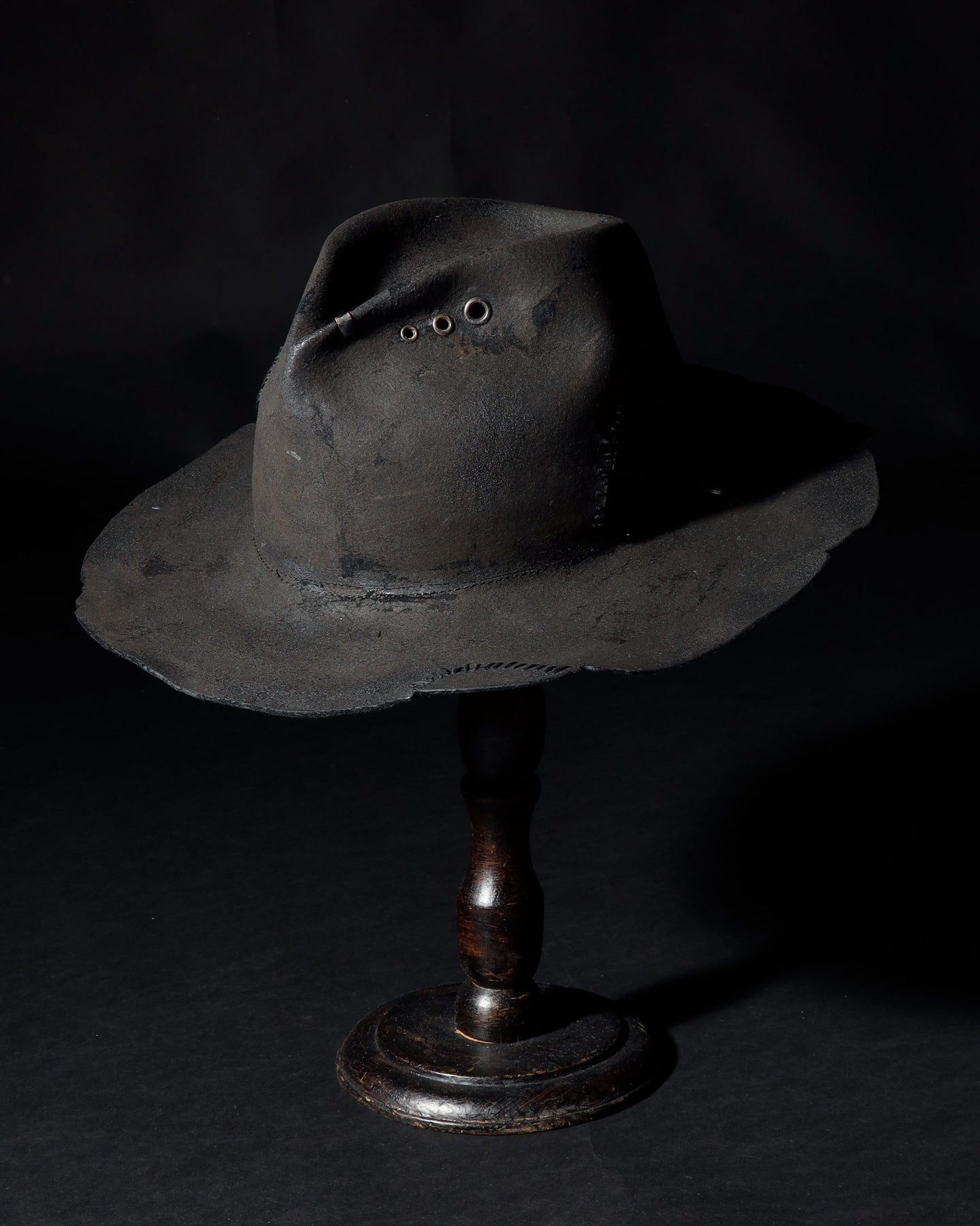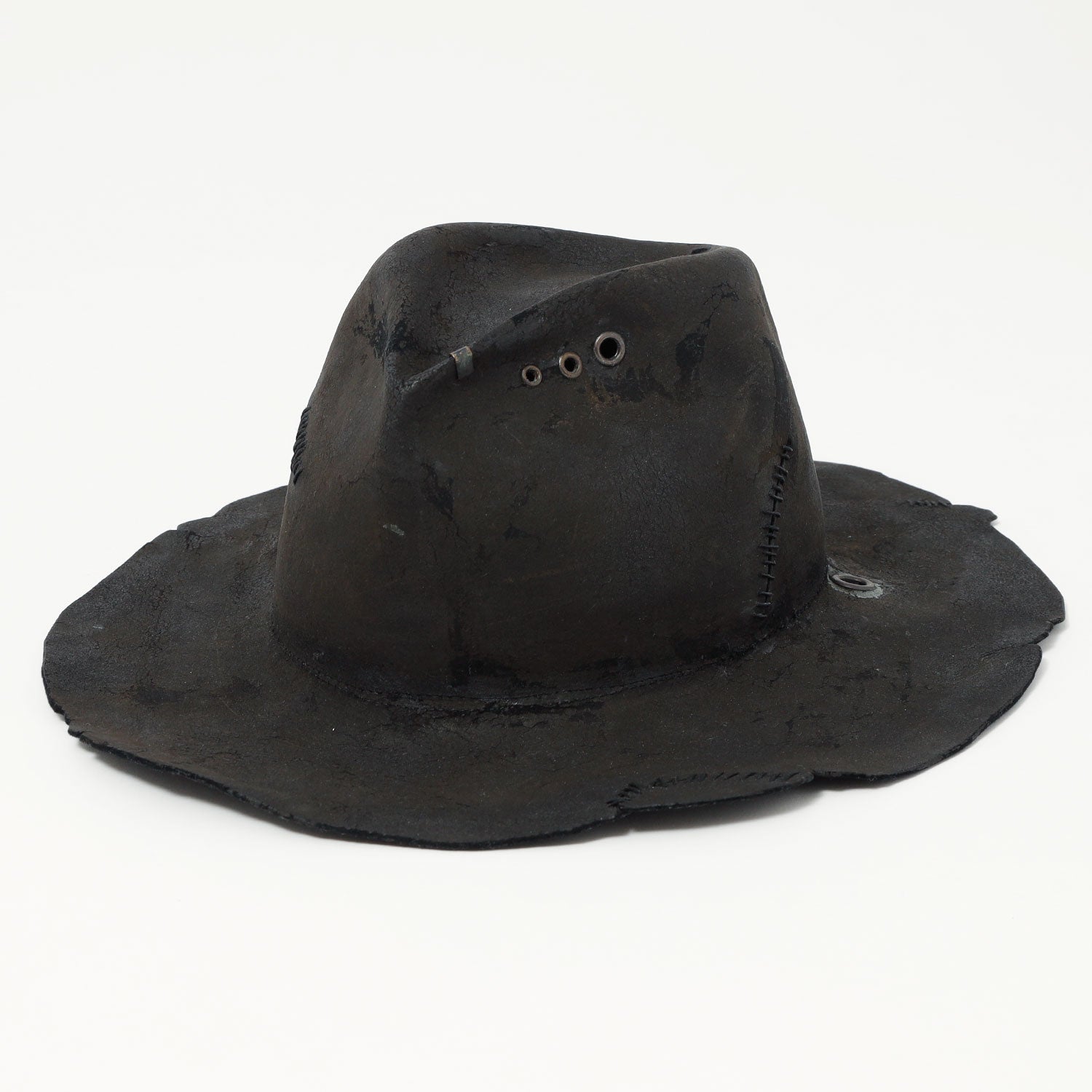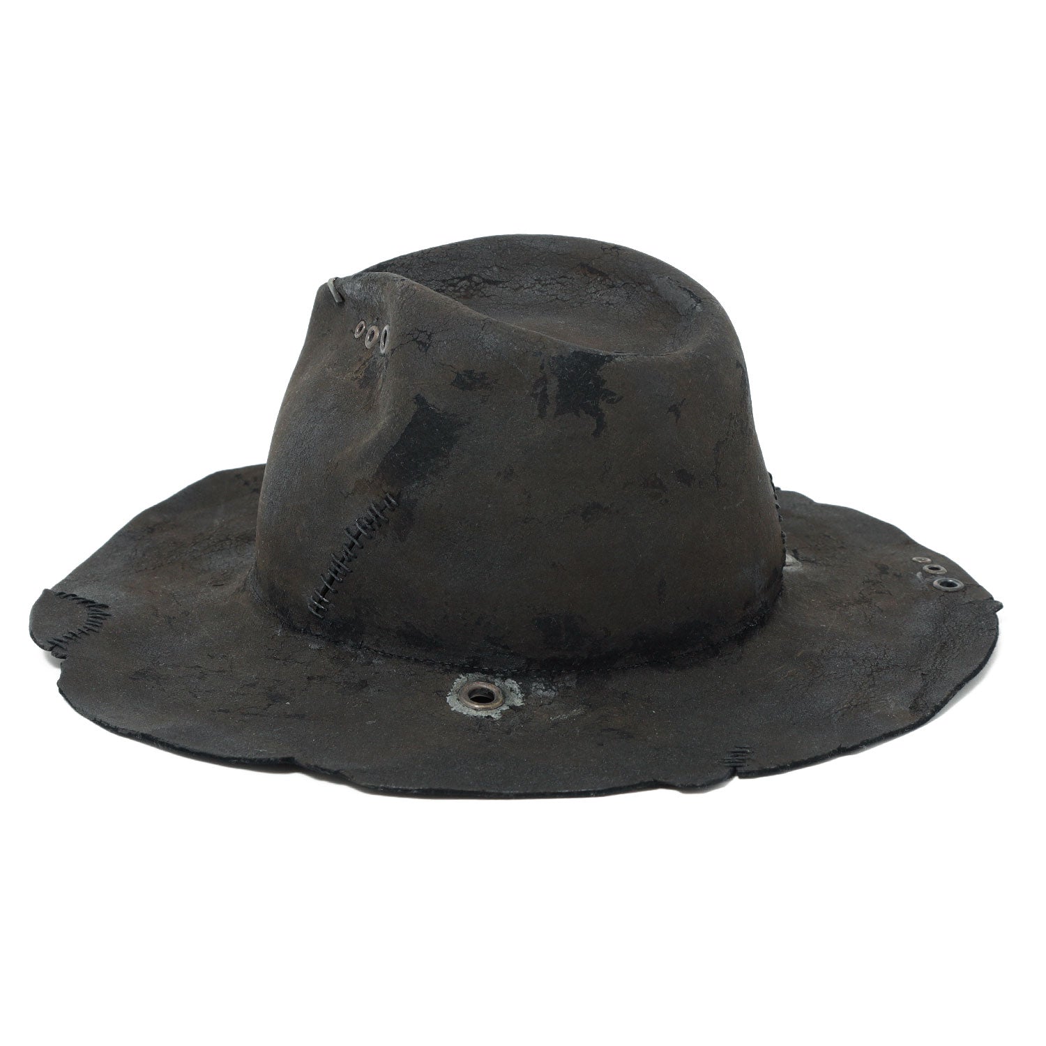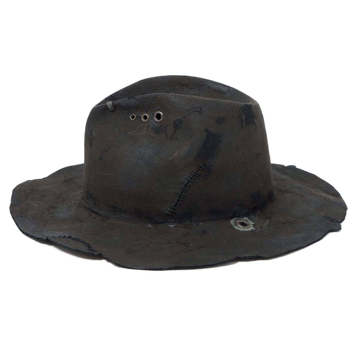 ■MATERIAL本体:ラビット飾り:ハトメ、金具■SIZE57.5cm~59cm(サイズ調節すべり付き)長さ/クラウンのフロント10.5cm、ブリム7.5~8cmラビット帽体を、炭のような雰囲気になるまでバーン加工した「charcoal」シリーズの中折れハット。特殊な保護剤を付けて、加工がとれづらくしていますロウ引き糸で飾りステッチを入れています。※水や湿気に大変弱く、濡れると型崩れや色落ちをする可能性があります。雨などは避けてご使用ください。※手作業の製作してるため商品によって個体差がございます。