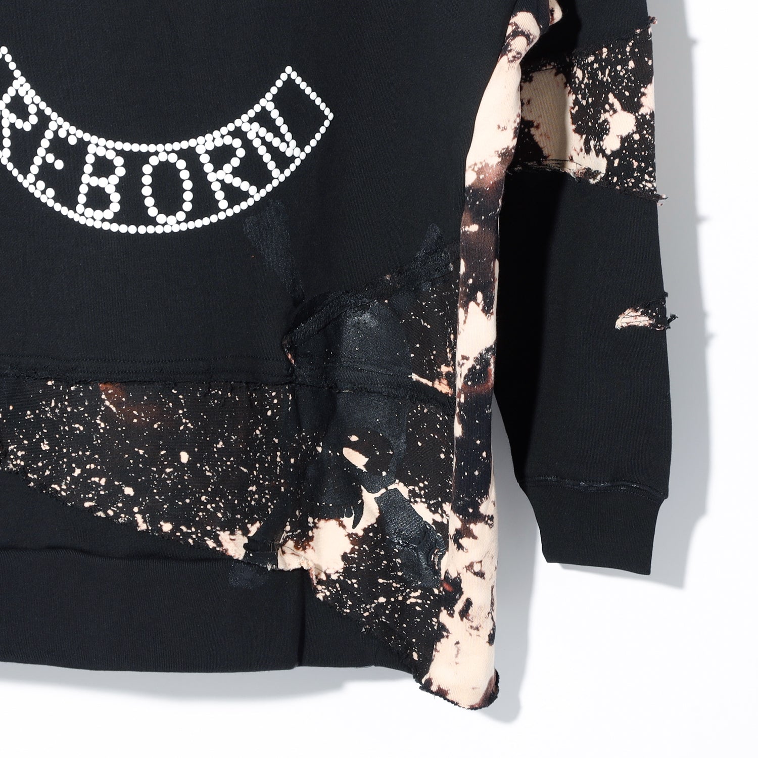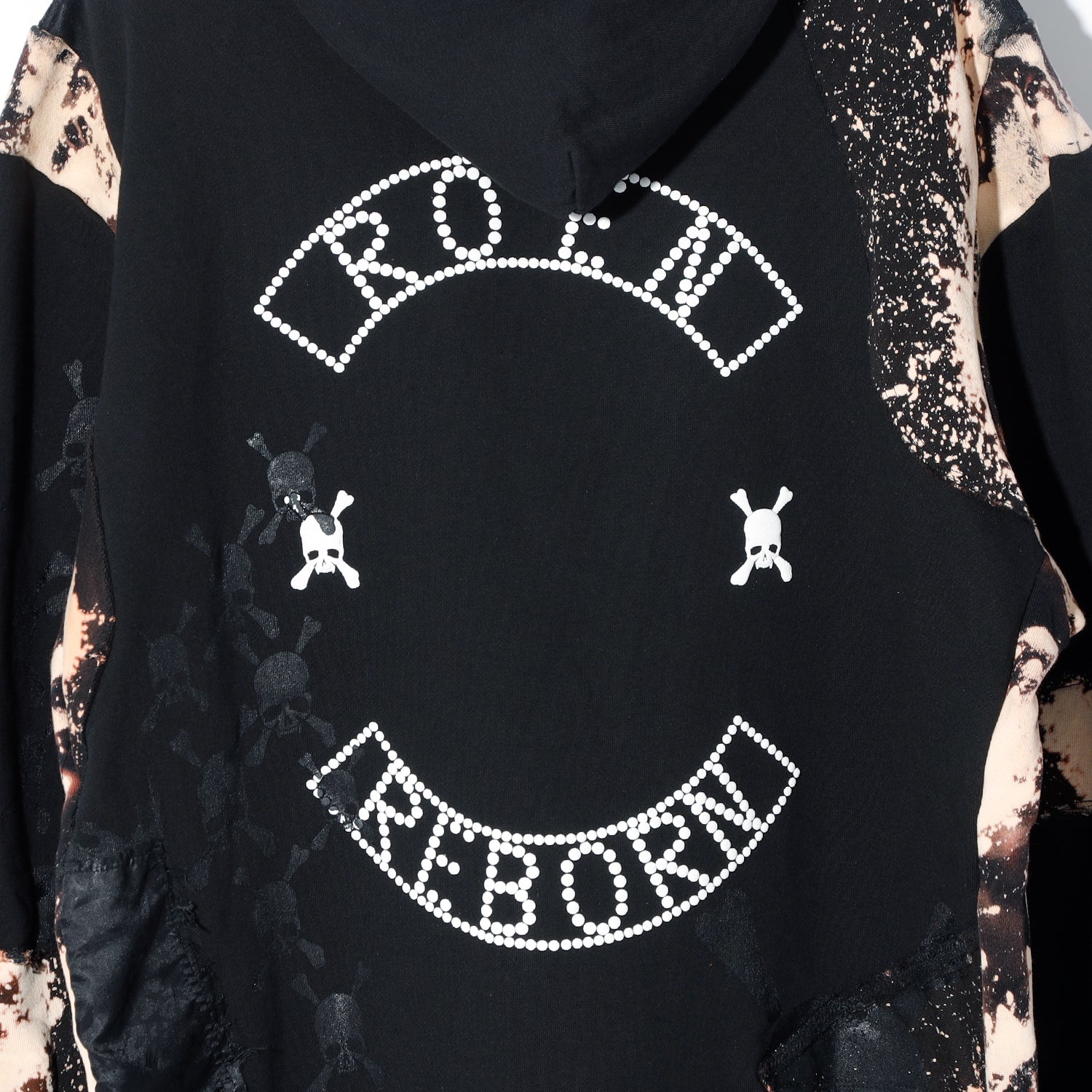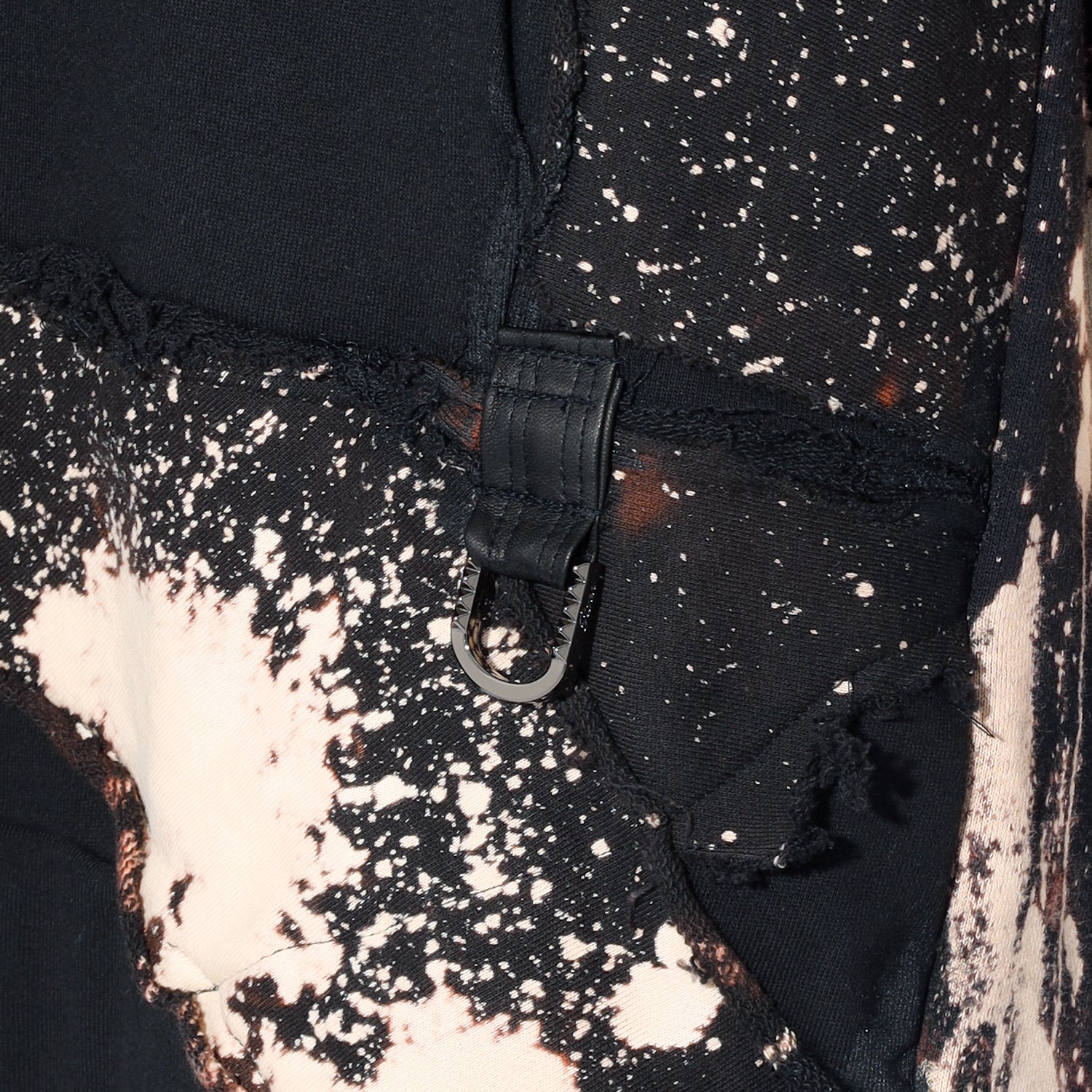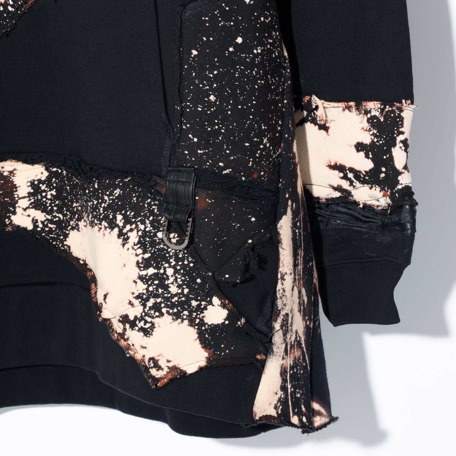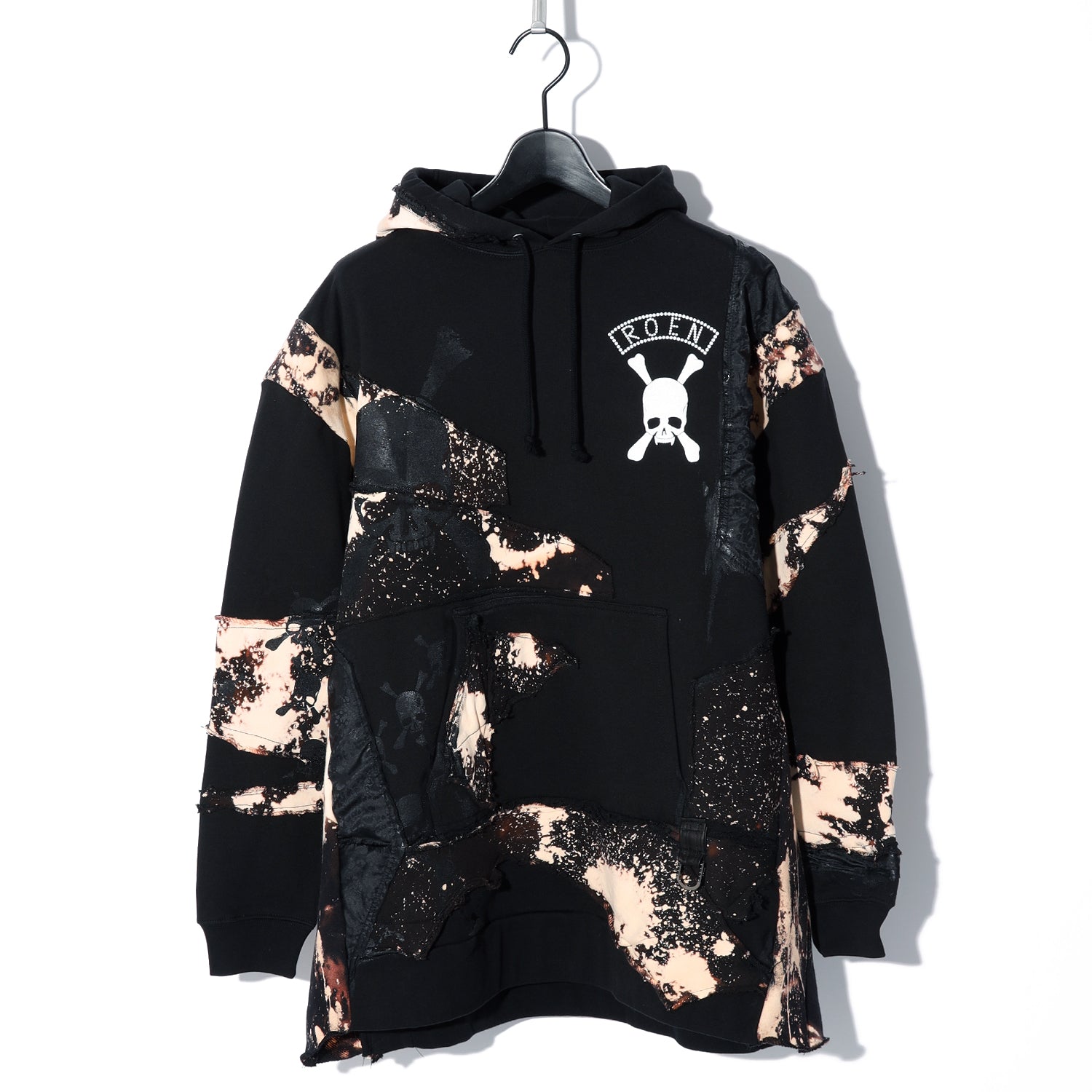 ■commentストリート色が強いメッセージPOをビッグシルエットにリメイク。フード、ボディ、袖の切替し部分にブリーチ加工とそうでない生地をスイッチングした手の込んだ作り込みになっております。またボディ全体にスカルプリントやコーティング、一部にはオリジナルDカンを使用したレザーパーツ。裾は適度な長さでカットオフしダメージ加工等、細部まで拘ったギミックが施されております。*本アイテムは一部デザイナーによるハンドメイドで商品加工/縫製を行っている一点物商品になっております。